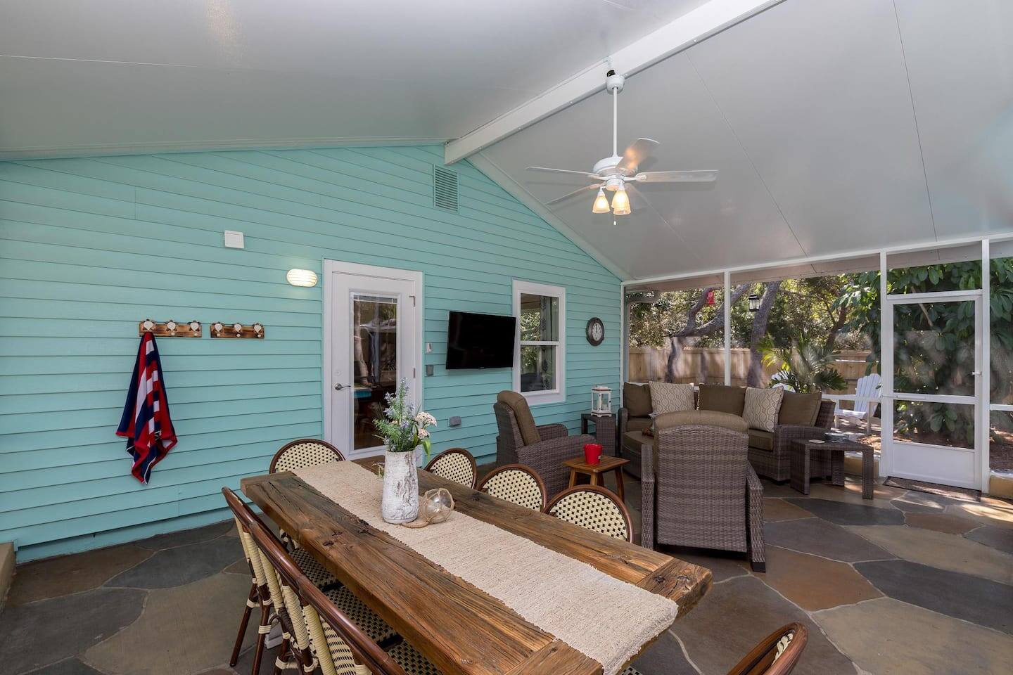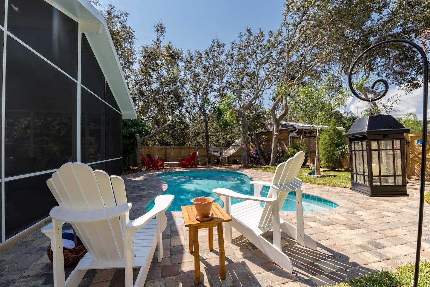 ★ MUST BE 25 YEARS OLD TO BOOK ★ ★ WE DO NOT ALLOW PETS ★ BACKYARD: The backyard was designed with complete privacy, relaxation and comfort in mind. We are close to the intercoastal and the beach, both offer boating, kayaking, and fishing. ✔ Solar Heated Pool - located in completely private large fenced in backyard ✔ Large Screened in Lanai w/SMART TV and Outside Dining Table ✔ Firepit w/Adirondack Chairs ✔ Outdoor Shower LIVING ROOM: ✔ Comfortable Sofa & Reading Chairs ✔ Large 55in SMART TV w/Cable ✔ Full Washer and Dryer right off of Kitchen ✔ Open Concept Living Room/Kitchen KITCHEN The kitchen is fully stocked with everything you need to make the perfect meal from appliances, cookware to tableware. ✔ Stove/Oven ✔ Microwave ✔ Toaster ✔ Blender ✔ Coffee Maker ✔ Double Door Refrigerator/Freezer - Filtered Water ✔ Dishwasher ✔ Glasses, Plates, Bowls, Silverware, Pots, Pans, Serving Trays & Utensils SLEEPING ARRANGEMENTS - 2 Bedrooms ✔ Bedroom 1 - King Sized Bed & Full Sized Pullout Couch w/ Ensuite Bathroom ✔ Bedroom 2 - Queen Sized Bed ✔ Sleeper Sofa in Living Room ** Bedrooms come with similar set of amenities ** - Premium Pillows, Linens and Sheets - Closets w/ Hangers - Night Stands w/Reading Lamps